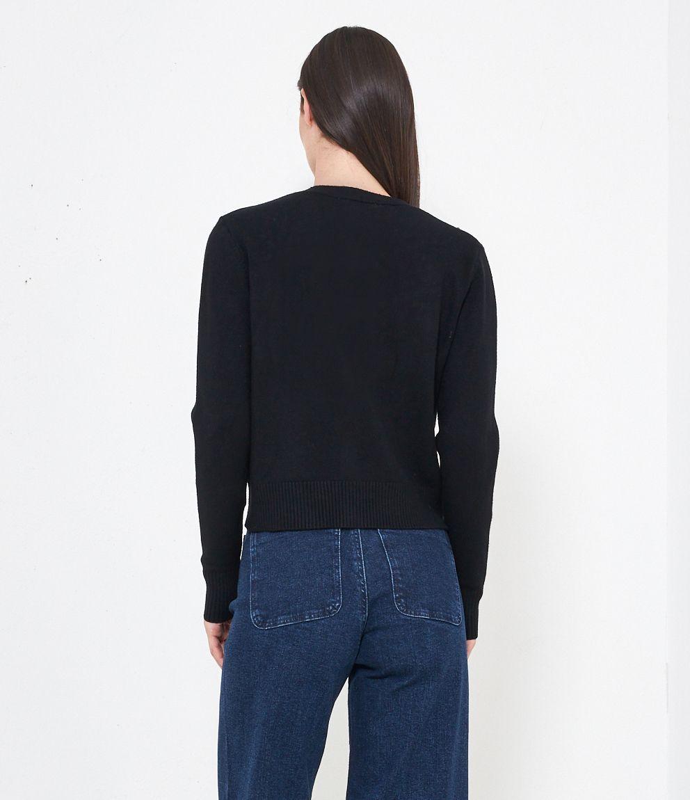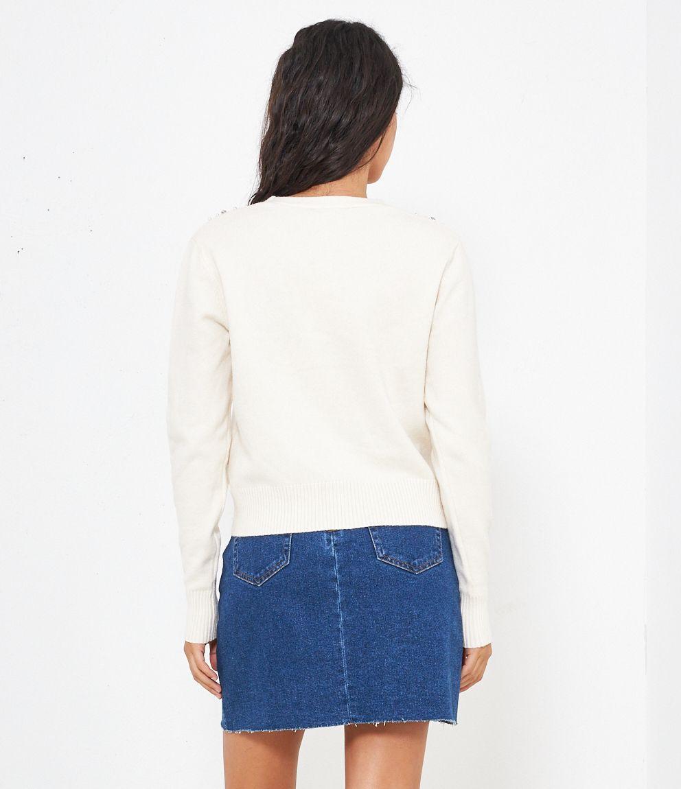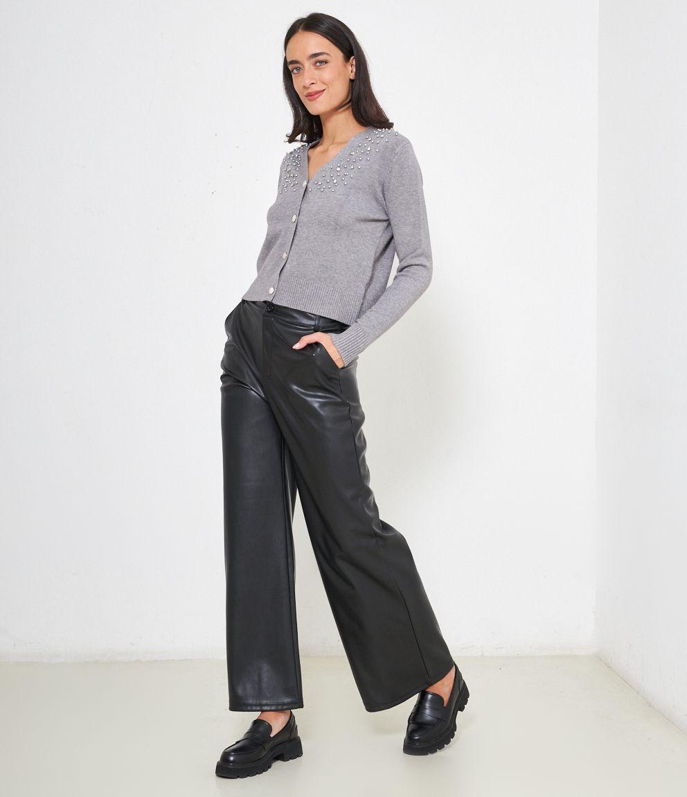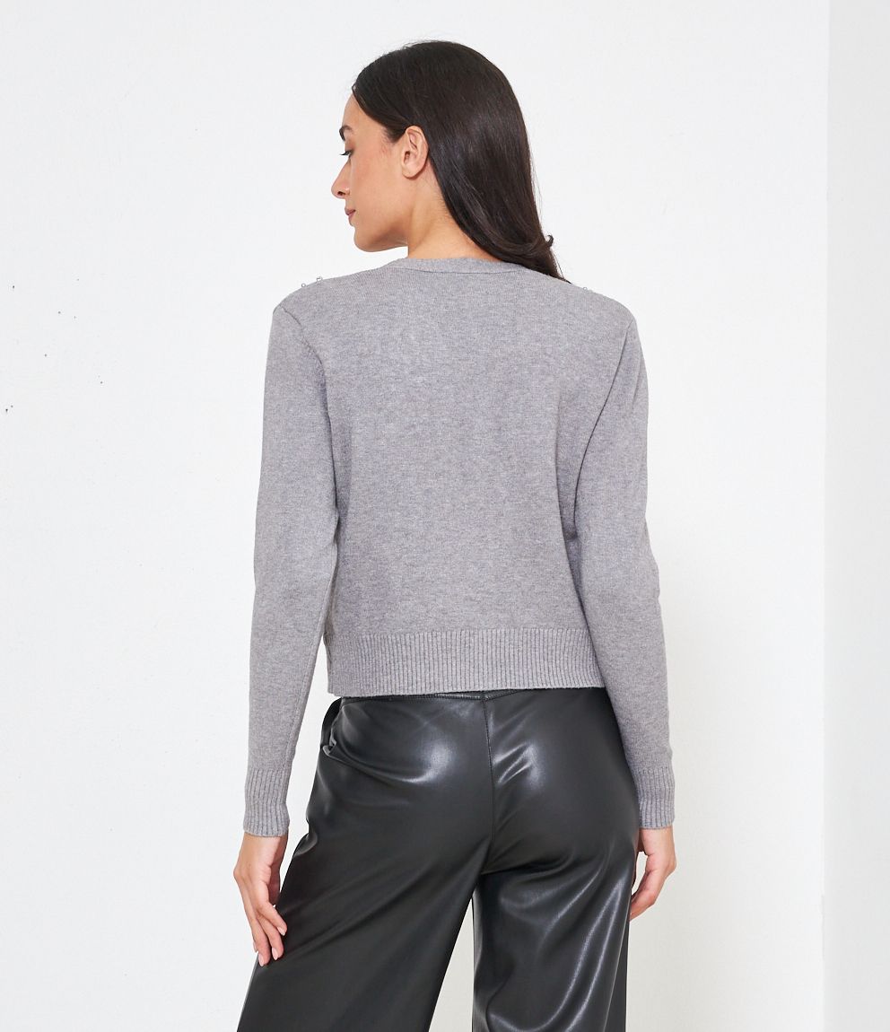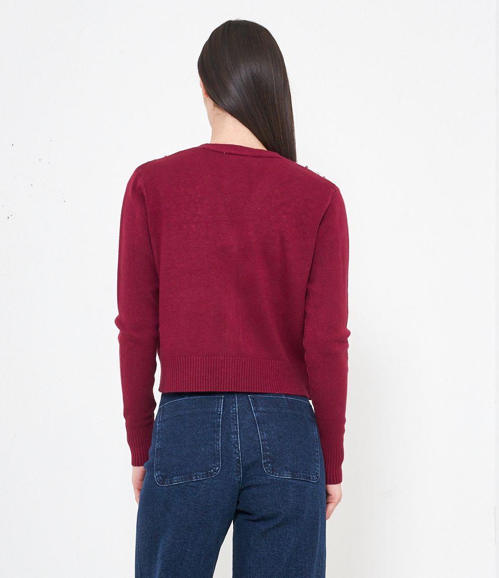 Cardigan con scollo a V, bottoni gioiello. Strass e perle applicate.