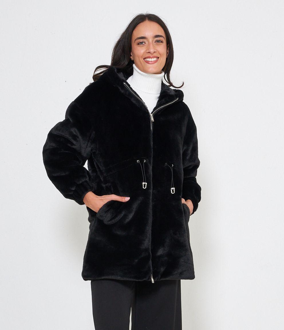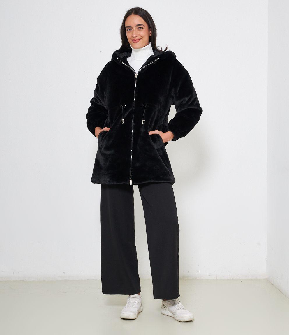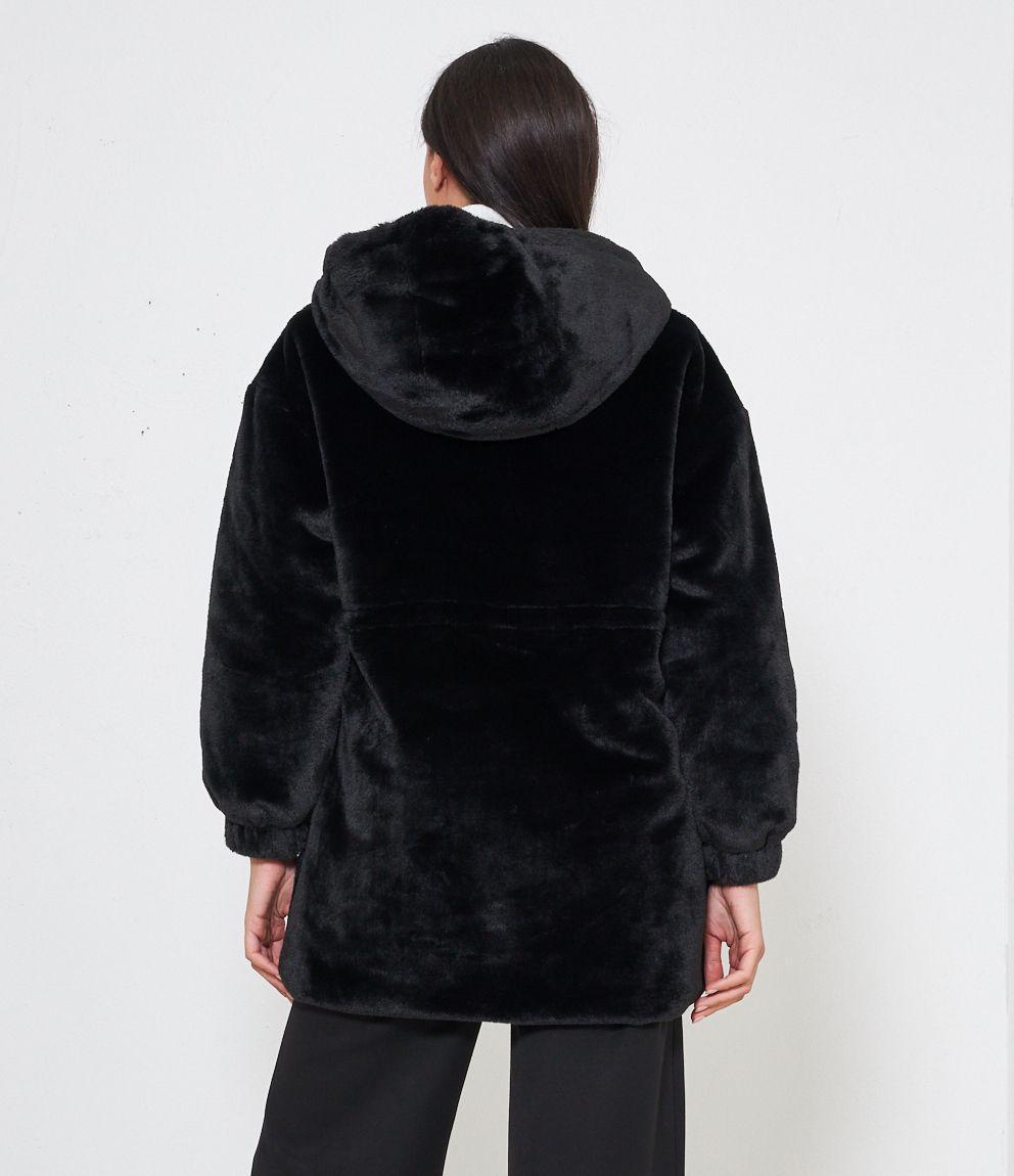 Pelliccia modello over con cappuccio. Chiusura con zip e coulisse regolabile.