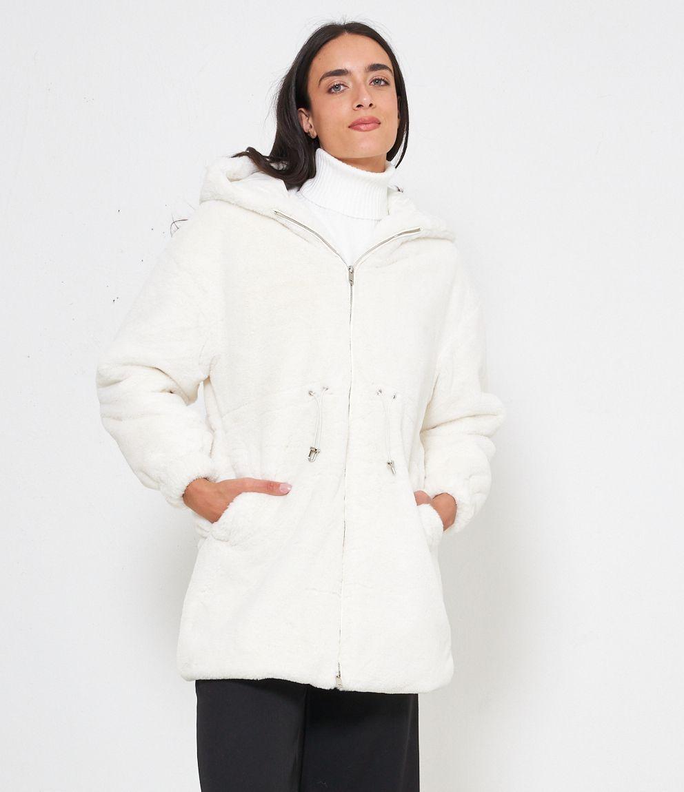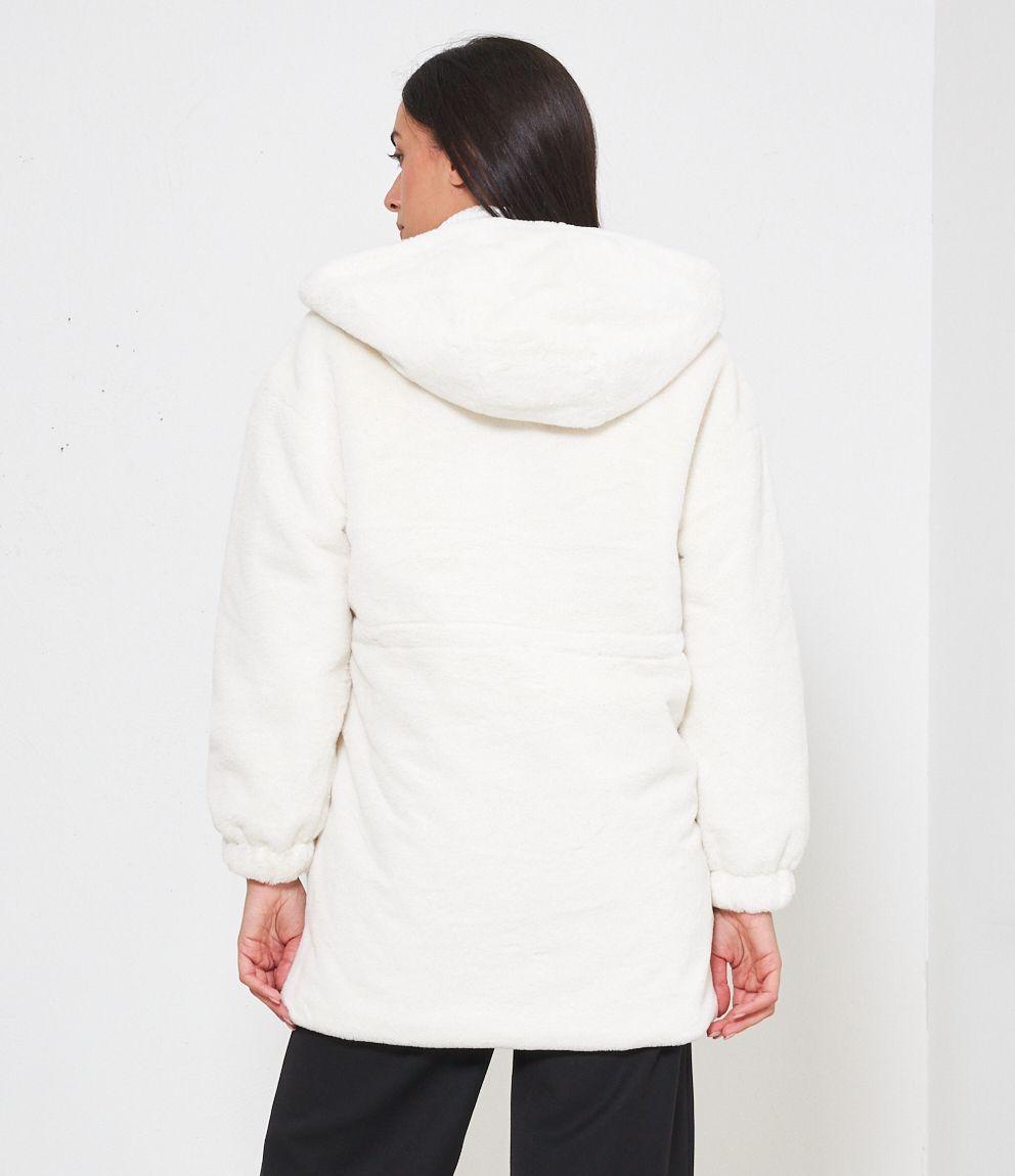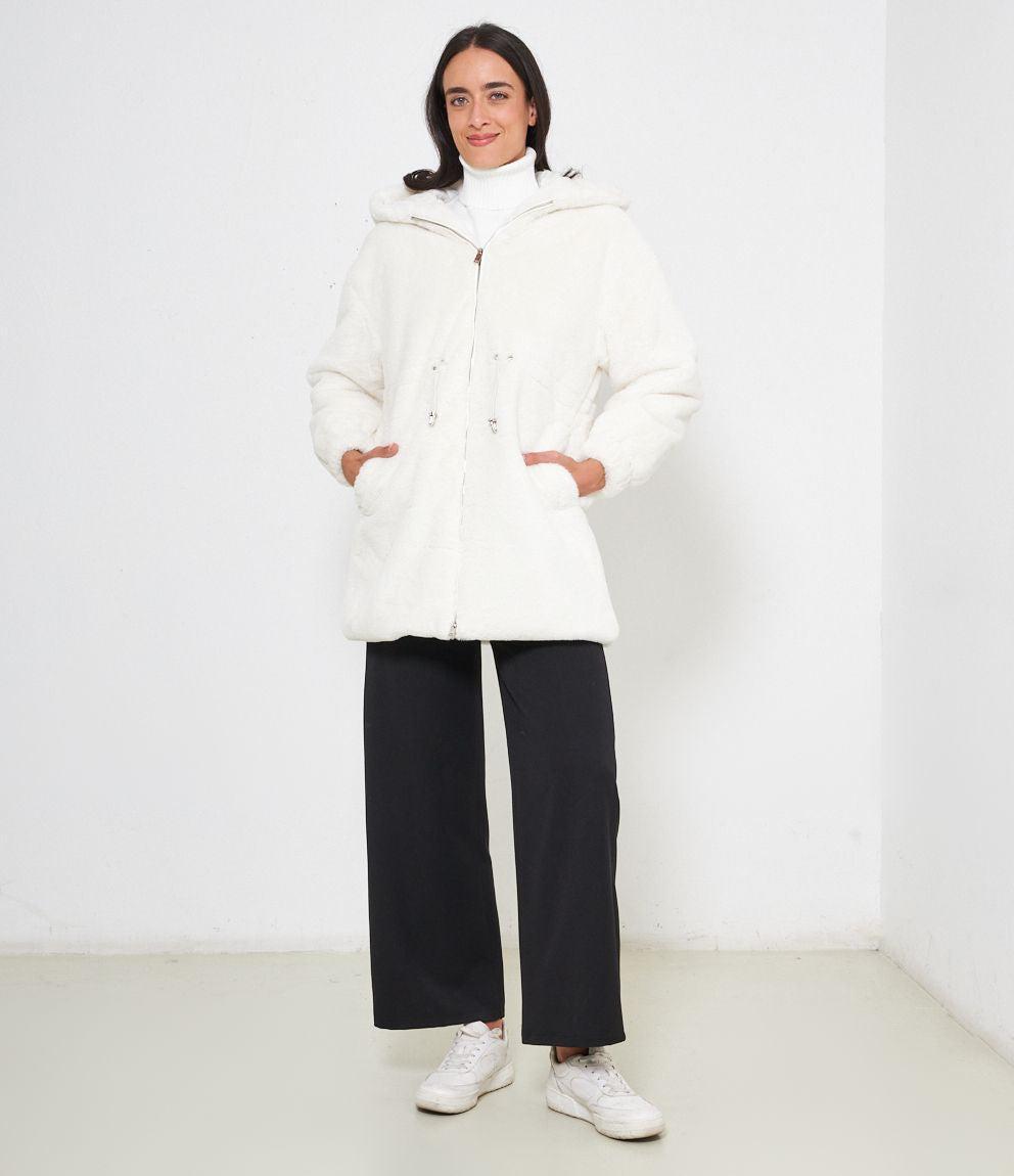 Pelliccia modello over con cappuccio. Chiusura con zip e coulisse regolabile.