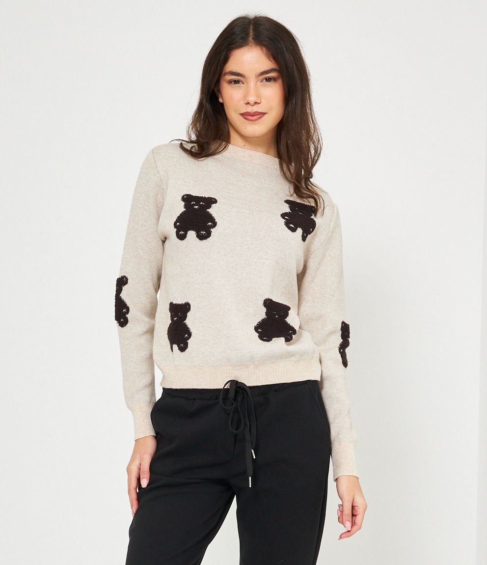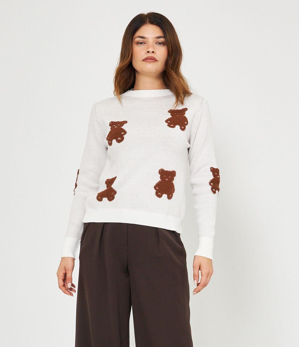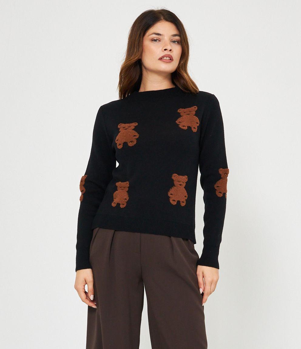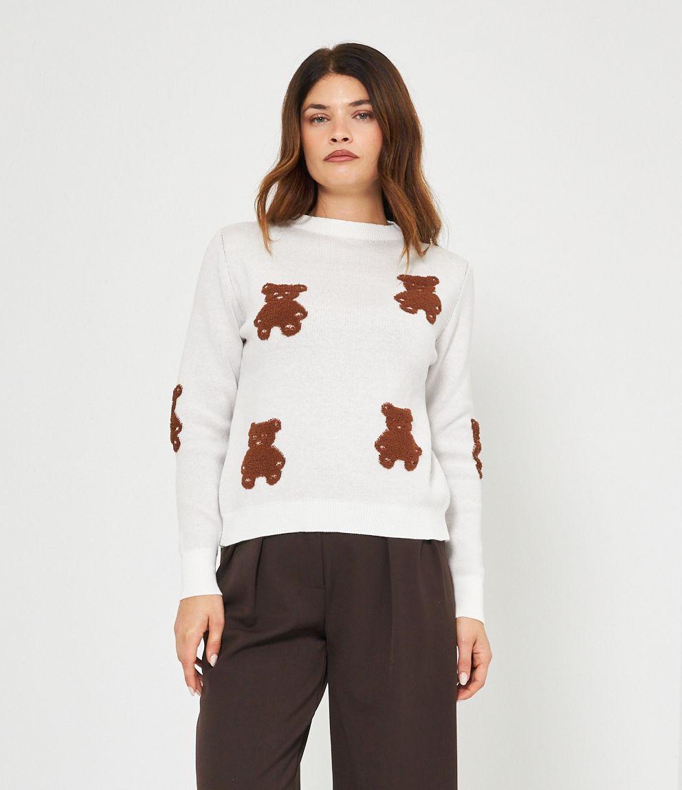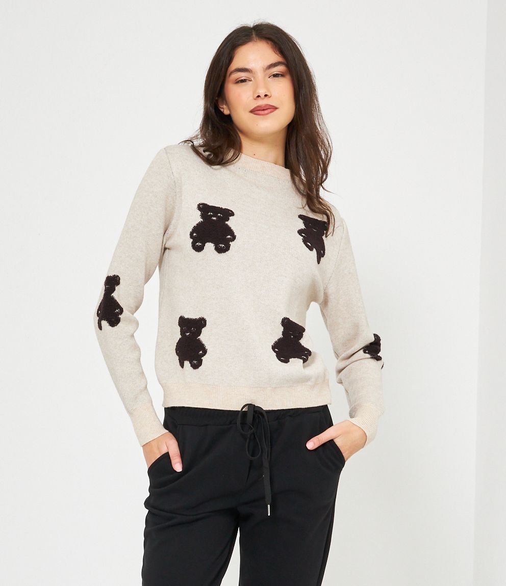 Maglia in viscosa con orsi a rilievo, girocollo e bordi a costine.